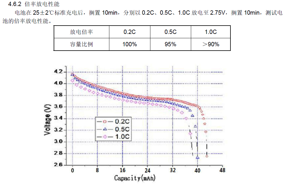 電池容量是指在環(huán)境溫度 20±5℃的條件下,以 0.5CmA 恒流充電,當(dāng)電池端電壓達(dá)到充電限制電壓 4.20V 后,放置不超過 1 小時(shí),再以 0.5CmA 電流恒流放電到 2.75V 所測(cè)的容量。